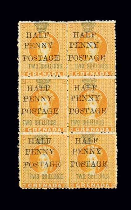 324 ogbl S.G. #43, 43c S.G. #43, 43c, 1889 "Half/Penny/Postage" provisional surcharge on 2/- Orange revenue, inverted first "S" in "Shillings", this variety is the right center stamp in a fresh mint block of six (2x3), block has variable centering but the error stamp is amazingly well centered, bright color, fresh o.g., center pair, including the error, is never hinged, very fine block containing a choice extremely fine variety (Scott #31, 31b; $425.00+). (Image) £335+