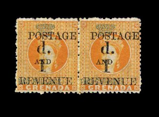 327 og S.G. #44, 44c imageS.G. #44, 44c, 1890 "1d./Revenue" and "Postage/and" provisional surcharge on 2/- Orange revenue, inverted first "S" in "Shillings", right stamp in lovely mint pair with normal stamp, far better centered than the vast majority of these orange revenue issues, brilliant color, o.g., lightly hinged, choice very fine; ex-Messenger and Hackmey (Scott #34b; $600.00+). (Image) £725+