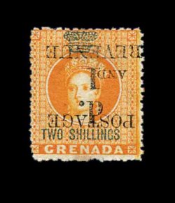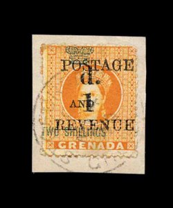 322 c S.G. #42 imageS.G. #42, 1888 "4d/Postage" provisional surcharge, 5mm spacing, on 2/- Orange revenue, a bright and quite well centered single tied to cover to Jersey in the Channel Islands by "Grenada/D/18/ AU 8" of the parish post office at Grenville (apparently this post office only had two digit "8" date plugs, so they could only put one in the year date), additional strike at left, Grenada transit on the reverse along with Jersey backstamp, minor adherence on the reverse, otherwise very fine; ex-Messenger and Hackmey. (Scott #32). (Image) Est. 400-500
