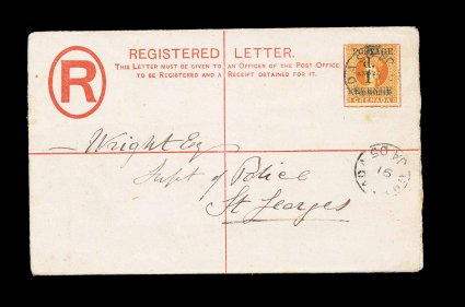 330 c S.G. #44 imageS.G. #44, 1890 "1d./Revenue" and "Postage/and" provisional surcharge on 2/- Orange revenue, fresh single with normal centering just into the design, tied to 2p Gray registry envelope (H&G #C1a; 152x96) by "Grenada/JA 06/91" c.d.s. with additional strike below, a very unusual local usage within St. George's to the Superintendent of Police, used in the proper December/January period of 1891 because of a shortage of 1p stamps for which this provisional was issued, very fine; 1970 BPA certificate (Scott #34). (Image) Est. 500-750