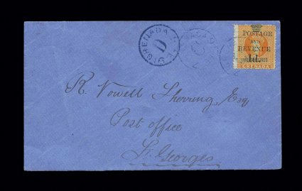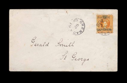 331 c S.G. #44 imageS.G. #44, 1890 "1d./Revenue" and "Postage/and" provisional surcharge on 2/- Orange revenue, attractive single tied to single franking scarce local cover within St. George's, by "Grenada/SP 19/92" c.d.s. with additional strike at left, late usage of this provisional, the collector notes that there is some evidence that there was a shortage of 1p values in August and September of 1892, very fine and scarce usage (Scott #34). (Image) Est. 750-1,000