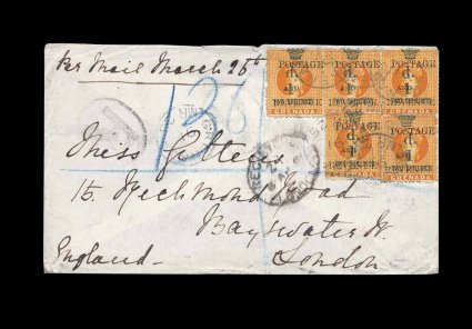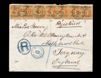 336 c S.G. #44 imageS.G. #44, 1890 "1d./Revenue" and "Postage/and" provisional surcharge on 2/- Orange revenue, strip of six and single all across the top of registered cover to England, paying the double postal rate and 2p for registry fee, stamps are quite well centered and tied by clear and well struck blackish blue "Grenada/D/29 JA 91" c.d.s. of the parish post office at Grenville, additional strike below and "R' in oval in the same ink (indicating this is a Grenville marking, this marking was often applied at St. George's), Grenada transit on the reverse and backstamped Torquay, very fine; an impressive cover from an outlying post office with the postage all paid by provisional surcharges; 1975 BPA certificate (Scott #34). (Image) Est. 1,000-1,500