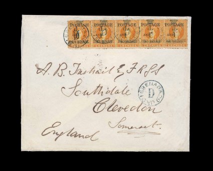 334 c S.G. #44 imageS.G. #44, 1890 "1d./Revenue" and "Postage/and" provisional surcharge on 2/- Orange revenue, an attractive horizontal strip of five, varied centering but quite nice for this, tied by blackish blue "Grenada/D/29 Jan 91" c.d.s. of the parish post office at Grenville, nice additional strike below, backstamped Clevedon, very fine and attractive cover; a nice double rate letter from a scarcer outlying post office; BPA certificate (Scott #34). (Image) Est. 1,000-1,500