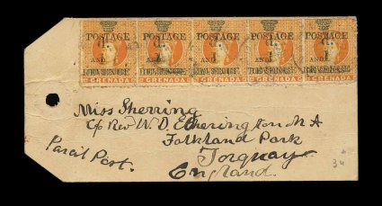 335 c S.G. #44 imageS.G. #44, 1890 "1d./Revenue" and "Postage/and" provisional surcharge on 2/- Orange revenue, horizontal strip of five with normal variable centering, just tied to parcel card to England by Grenada c.d.s. of St. George's of December 27, 1890 c.d.s., marked "Parcel Post" in manuscript, creases and wrinkles to card slightly affecting the stamps, pinholes affecting left stamp, probably where attached to parcel, very fine appearance and extremely scarce usage; Grenada authorized parcel post in their postal regulations on October 1, 1885, but this was a service little used and this is the first item that gives evidence of having been sent by that service (Scott #34). (Image) Est. 750-1,000