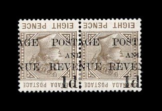 340 og S.G. #46b imageS.G. #46b, 1891 "Postage/and/Revenue/1d." provisional surcharge on 8p Grey brown, surcharge inverted, and additionally shifted to the left making for a nearly evenly split overprint, horizontal pair, o.g., small h.r., attractive and very fine error; ex-Russell Jones (Scott #36b; $650.00). (Image) £600