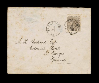 341 c S.G. #46 imageS.G. #46, 1891 "Postage/and/Revenue/1d." provisional surcharge on 8p Grey brown, tied to internal cover by scarce "Grenada/A/11 FE 91" c.d.s. of the parish post office at Gouyave, posted to the Colonial Bank in St. George's, backstamped, cover has light foxing slightly affecting the perf. tips, otherwise very fine; this provisional on cover is scarce used from an outlying post office, particularly so used for internal postage, for which it was intended, and in the proper period of early 1891 when there was a shortage of 1p stamps (Scott #36). (Image) Est. 400-500