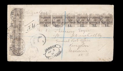 342 c S.G. #46 imageS.G. #46, 1891 "Postage/and/Revenue/1d." provisional surcharge on 8p Grey brown, a nicely franked 1891 registered cover to Jamaica, with horizontal strips of six and four of this provisional surcharge, for 8p double rate postage and 2p registry fee, all tied by "Grenada/MR 18 91" c.d.s., double oval Jamaica registry receiving postmark, all markings are on the front, small backflap at left missing and edge soiling and small tears, mostly at the bottom and not affecting stamps or markings, fine and scarce cover used in the proper period of use (Scott #36). (Image) Est. 400-500