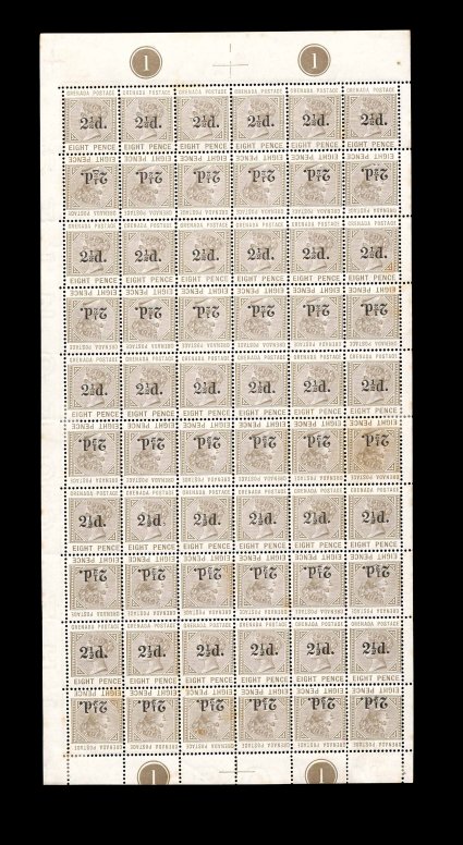343 ogbl S.G. #47a S.G. #47a, 1891 "2 1/2d" provisional surcharge on 8p Grey brown, tete-beche pair, a full mint sheet of 30 pairs, unlike the 1p surcharge on this value the selvage was not removed, this sheet with full selvage on all four sides, o.g., 23 tete-beche pairs are n.h., but gum toning on the reverse (not very apparent from the front) affects all but seven never hinged pairs, plus a couple of stamps with tiny thins, varied centering, fine-very fine appearance; the center row of tete-beche pairs shows the two different type "2"'s in "1/2"; interestingly position R7/2 has a partial period after "d" which is not much different than the one in the 1p surcharge sheet on this same value, but unlisted; this is the only known intact sheet to the collector (Scott #37a, 38a, 38b; $3,750.00+). (Image) £1,200+
