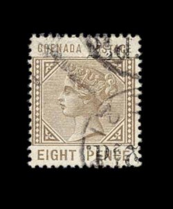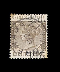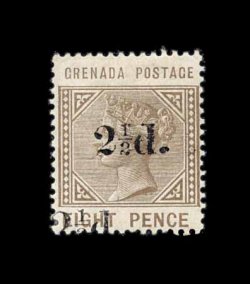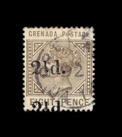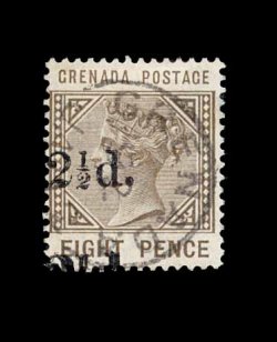 349 O S.G. #47e imageS.G. #47e, 1891 "2 1/2d." provisional surcharge on 8p Gray brown, surcharge triple, with a portion of two additional surcharges at bottom, attractively used with central Grenada c.d.s. cancel, very fine error and scarce; 1986 RPS certificate; ex-Messenger and Hackmey (Scott #38e; $1,100.00). (Image) £900