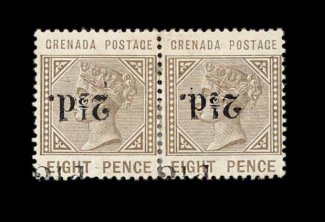 350 O S.G. #47f imageS.G. #47f, 1891 "2 1/2d." provisional surcharge on 8p Grey brown, surcharge triple, two inverted, with portions of two inverted surcharges at bottom, very well centered used single, light central Grenada c.d.s. cancel, extremely fine and very difficult error, especially in this premium condition; 1985 RPS certificate (Scott #38f; $1,000.00). (Image) £850