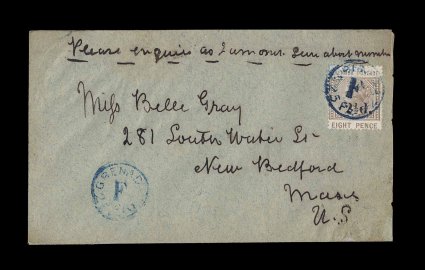 351 c S.G. #47 imageS.G. #47, 1891 "2 1/2d." provisional surcharge on 8p Gray brown, attractive single tied to cover to the United States by very scarce blue "Grenada/F/25 FE 92" c.d.s. of the outlying post office on the island of Carriacou in the Grenadines, additional strike at left, Grenada transit of St. George's and New York transit on the reverse, backstamped New Bedford, quaint note at top "Please enquire as I am not sure about number", referring to the street number in the address, edge tear to the cover at bottom right, otherwise very fine and one of the scarcer parish post offices (Scott #38). (Image) Est. 500-750
