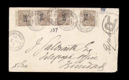 352 c S.G. #47, 47a imageS.G. #47, 47a, 1891 "2 1/2d." provisional surcharge on 8p Grey brown, tete-beche strip of three, showing both types of the "2" in "1/2", plus a single on a registered cover to the Telegraph Office at Trinidad, paying a triple rate of 7 1/2p and 2p registry fee (1/2p overpaid), all tied by "St. George's/Grenada/FE 2 92" c.d.s., opened a bit roughly at right causing a tiny piece to be missing at top, otherwise a very fine commercial usage during the proper time for this provisional surcharge (Scott #38, 38c). (Image) Est. 400-500