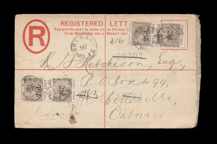 353 c S.G. #47a imageS.G. #47a, 1891 "2 1/2d" provisional surcharge on 8p Grey brown, tete-beche pair, two pairs tied to 2p Gray registry envelope (H&G #C1a; 152x96mm) to Canada by "Grenada/NO 12 92" c.d.s., New York registry oval and Toronto transits on the reverse, backstamped Belleville, opened a bit roughly at right with minor edge wear, fine and scarce with tete-beche pairs paying a quadruple British Empire rate (Scott #38a). (Image) Est. 400-500