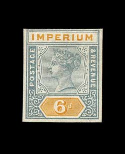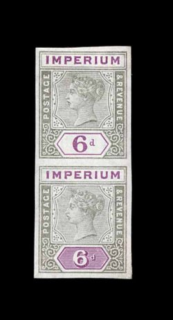 355 E image1895 6p Grey and mauve Key Plate essay, se-tenant vertical pair with shaded and unshaded value tablets, imperforate on gummed watermarked paper, a generic essay to show this design and its variations as well as various color combinations, inscribed "Imperium" in the country name tablet, sometimes painted over by designers to show specific details of a particular country, very fine. (Image) Est. 200-300