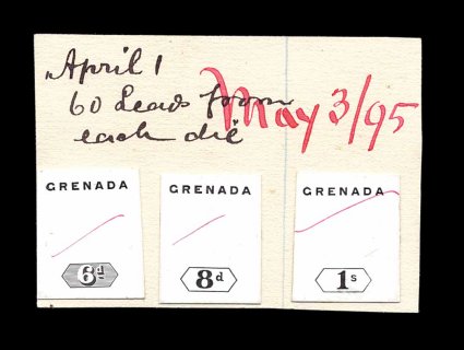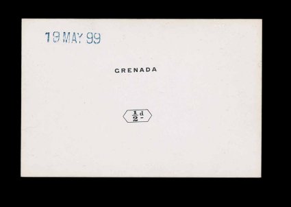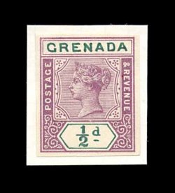 359 E S.G. #48 imageS.G. #48, 1899 1/2p Mauve and green, Key Plate essay, an imperforate plate proof of the frame in the issued mauve affixed to small piece of card from an archival sheet, "Grenada" inscription and "1/2d" value tablet hand painted in green, resembling the issued stamp, very fine and attractive essay (Scott #39). (Image) Est. 300-400