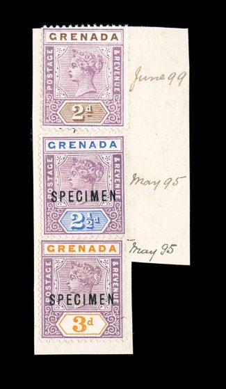 357 S S.G. #48s-55s imageS.G. #48s-55s, 1895-99 1/2p-1/- Queen Victoria with "Specimen" overprints cplt., a specialized collection of 32 stamps with various types starting out with a complete set from the De La Rue archives, each affixed to small pieces of archival sheets with manuscript dates next to each a few months before the issuance date and evidently the dates they were printed, six of these have the normal "Specimen" overprint showing a flaw to right leg of "M" in "Specimen" (club foot variety), 1/2p and 2p, the last 1899 values, have no overprint (as they were put on the archival sheets), but additional copies with "Specimen" overprints are present to complete the set, also includes vertical strip of five of 1p and horizontal strips of four of the 2 1/2p 3p, 6p and 8p values, "Specimens" are scarce in multiples, o.g. or part o.g. except for the archival copies, very fine and a nice lot (Scott #39S-46S). (Image) Est. 500-750