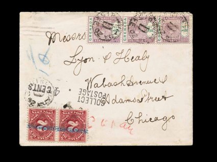 361 c S.G. #48 imageS.G. #48, 1899 1/2p Mauve and green, vertical strip of three tied to commercial cover to the United States by scarcer "Grenada/D/FE 15 02" c.d.s. of the parish post office at Grenville, St. George's transit and backstamped Chicago, unfortunately the proper rate was 2 1/2p, marked due at St. George's with bold "T", attractive pair of U.S. 2c Deep claret (Scott #J39) applied in Chicago with neat "Collect/Postage - 4 Cents" handstamp above, very fine; not only a scarce posting but a nice postage due cover (Scott #39). (Image) Est. 200-300