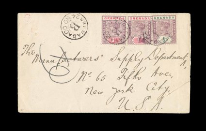 362 c S.G. #48, 49 imageS.G. #48, 49, 1899 1/2p Mauve and green and 1896 1p Mauve and carmine pair, tied to commercial cover to The Manufactures' Supply in New York by scarce "Grenada/B/24 NO 00" c.d.s. of the parish post office in Victoria, St. George's transit on the reverse, backstamped, tear to cover in opening at bottom right, not affecting its very fine appearance or the important elements of the cover; a scarce posting as little mail came out of this parish (Scott #39, 40). (Image) Est. 300-400