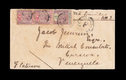 363 c S.G. #48, 49 imageS.G. #48, 49, 1899 1/2p Mauve and green and 1896 1p Mauve and carmine, two singles of the latter, all tied to scarce cover to the British Consulate at Curacao, "Venezuela" (actually Dutch Antilles) by very scarce "Grenada/F/27 MY 01" of the parish post office at Carriacou in the Grenadines, St. George's and Trinidad transit, routed this way as there was no scheduled service between the British West Indies and Curacao, backstamped, mild toning to stamps, otherwise a very fine cover from a scarce small post office to an equally scarce destination (Scott #39, 40). (Image) Est. 300-400