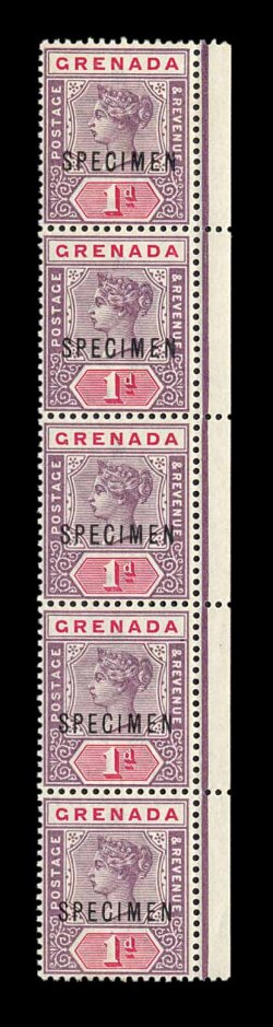 364 S S.G. #49s/55s S.G. #49s/55s, 1895-96 1p-1/- Queen Victoria with "Specimen" overprints cplt. for the five values originally issued in 1895, plus the 1p value issued in 1896, each in a strip of five, all horizontal except the 1p which is a vertical strip, o.g., at least three stamps in each strip are n.h., very fine-extremely fine; a total of 750 specimens of each value were issued for distribution to UPU members, it was normal practice to send five examples to each country, normally these were broken up and distributed within the country, only a few were kept together in multiples such as these making this an extremely scarce unit (Scott #40S/46S). (Image) Est. 500-750