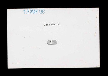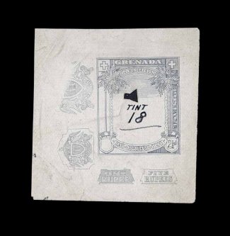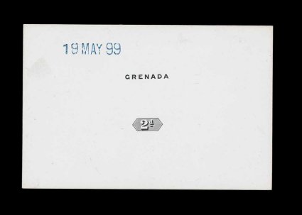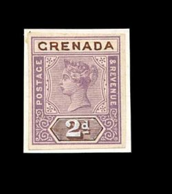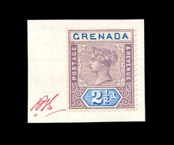 371 E S.G. #51 imageS.G. #51, 1895 2 1/2p Mauve and ultramarine, Key Plate essay, a perforated plate impression of the frame in the issued mauve affixed to small piece of card from archival sheet, initialed "B.B. in red "Grenada" inscription and "2 1/2d" value tablet hand painted in ultramarine, resembling the issued stamp, very fine (Scott #42). (Image) Est. 300-400