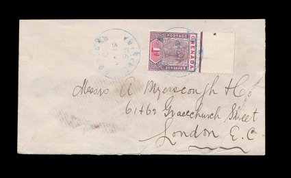 366 c S.G. #49 imageS.G. #49, 1896 1p Mauve and carmine, top sheet-margin single tied to 1899 cover to London by blue "Concord/Grenada/JA 19 99" c.d.s., with additional strike at left, St.George's transit and backstamped, cover roughly opened causing tear at bottom right and being opened on more than one side, plus some glue stains, nevertheless fine and a rare cover; Concord is a village in the St. John's Parish and is one of the earliest village post offices opening in 1890, it is also the last post office to use a colored cancel, ending the practice in 1900 (Scott #40). (Image) Est. 400-500