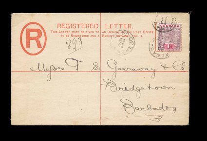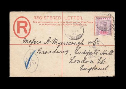 367 c S.G. #49 imageS.G. #49, 1896 1p Mauve and carmine, tied to small 2p Green blue registry envelope (H&G #C2; 133x83mm) to England by scarce "St. David's/Grenada/OC 24 01" parish post office c.d.s., St. George's transit, backstamped London, very five; an attractive example of the 1p rate within the British Empire from a small town (Scott #40). (Image) Est. 200-300