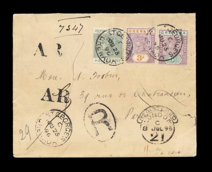 372 c S.G. #52, 53 imageS.G. #52, 53, 1895 3p Mauve and orange and 6p Mauve and green, on 1896 registered and return receipt cover to France, in mixed franking with 1883 1/2p Dull green (S.G. #30), to make the 9 1/2p rate as the 1/2p of the new Victoria issue had not been issued yet, all tied by "St. George's/Grenada/JU 25 96" c.d.s,, London transit and backstamped Paris, attractive and very fine cover, an uncommon usage (Scott #20, 43, 44). (Image) Est. 200-300