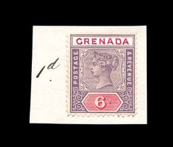 373 E S.G. #53 imageS.G. #53, 1895 6p Mauve and carmine, Key Plate essay perforated essay inscribed "Imperium" which has been painted out in white and "Grenada" hand painted instead, affixed to small piece of card from archival sheet, manuscript "1d." at left indicating the value that would be issued with this color combination, handsome and very fine essay (Scott #44). (Image) Est. 300-400