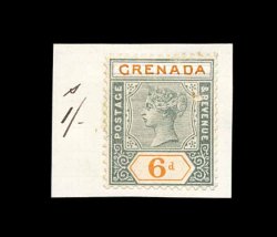 374 E S.G. #53 imageS.G. #53, 1895 6p Green and orange Key Plate essay, perforated essay inscribed "Imperium" which has been painted out in white and "Grenada" hand painted instead, affixed to small piece of card from archival sheet, manuscript "s 1/-" to indicate the value that would have this color combination, tiny facial scuff to right of head, otherwise very fine; ex-Russell Jones (Scott #44). (Image) Est. 200-300