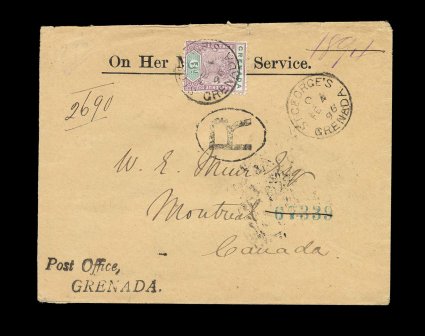 375 c S.G. #53 imageS.G. #53, 1895 6p Mauve and green, tied to OHMS registered official cover to Canada by "St. George's/Grenada/FE 4 96" c.d.s., two line "Post Office,/Grenada" official handstamp at bottom left, this marking was recorded in the London proof book on May 13, 1895, this is the only recorded example, New York transit and backstamped Montreal, couple tiny edge tears at top, otherwise very fine (Scott #44). (Image) Est. 200-300