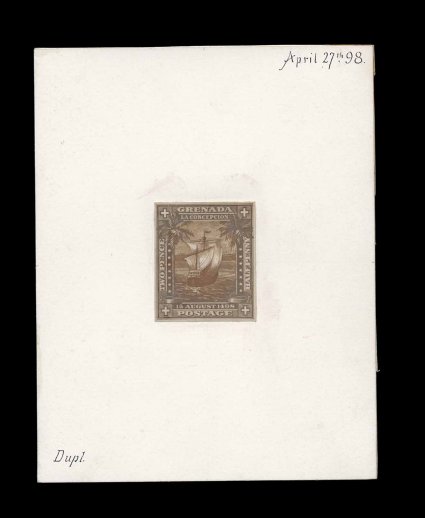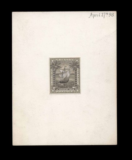 380 E S.G. #56 imageS.G. #56, 1898 2 1/2p Columbus Commemorative, engraved die essay of partially completed design, in black on white glazed paper, nearly complete as issued, but the sky is essentially blank without shading, date of "16-5-98" in pencil on the reverse, small edge faults including tear at top just into the frame, very fine appearance and quite likely a unique archival proof (Scott #47). (Image) Est. 400-500