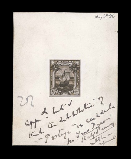 378 E S.G. #56 imageS.G. #56, 1898 2 1/2p Columbus Commemorative, artist's photo essay, approximately stamp size, mounted on card measuring 90x114mm and dated "May 5th 98" the date this new design was sent to the Crown Agents, much closer to the issued design and in manuscript at bottom it is marked approved subject to changing the denomination in the two side tablets for "Postage", which was the way the stamp was issued, very fine and a unique archival essay (Scott #47). (Image) Est. 500-750