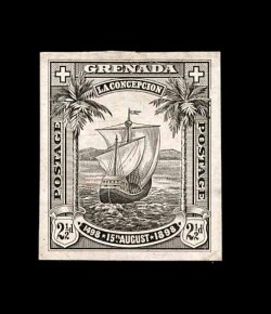 376 E S.G. #56 imageS.G. #56, 1898 2 1/2p Columbus Commemorative, artist's photo essay, approximately stamp size mounted on card measuring 90x115mm and dated "April 27th 98", the date sent to the Crown Agents, hand painting of highlights in the ship, differs from the issued stamp in the design and composition of the frame including stars at sides, the Crown Agents returned it to De La Rue on April 29th making some recommendations for changes in the frame, very fine and rare essay (Scott #47). (Image) Est. 500-750