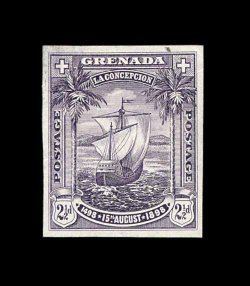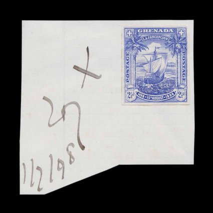 381 P S.G. #56 imageS.G. #56, 1898 2 1/2p Columbus Commemorative, archival proof in the issued ultramarine color, imperforate on white paper, affixed to piece of archival sheet with manuscript date of July 1, 1898, apparently indicating approval of the color, very fine; because of the size of this and the other trial colors it is not possible to tell whether these are plate proofs or die proofs, but given the very limited number and context of production, it is quite likely they are die proofs (Scott #47). (Image) Est. 400-500