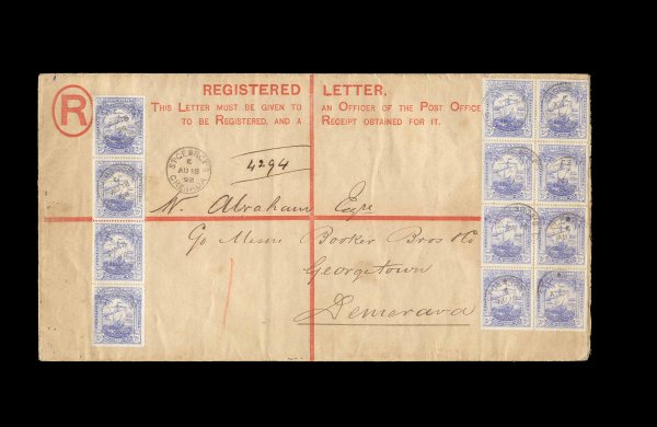 383 c S.G. #56 imageS.G. #56, 1898 2 1/2p Columbus Commemorative, vertical strip of four and block of eight (2x4), on a First Day Cover of this first commemorative of Grenada, on appropriately large 2p Gray registry envelope (H&G #C1e; 292x152mm) with essentially central "St. George's/Grenada/AU 18 98" first day c.d.s., a couple cancels on the block just tie and matching strike on the cover, posted to Georgetown, British Guiana, where backstamped, very fine example of this largest and little used registry envelope; the Columbus Commemorative was scheduled to be issued on August 15th but there was a three day delay in receiving the stamps from England, which is well documented in the "Grenada Government Gazette", this cover is the only recorded first day cover for this commemorative stamp (Scott #47). (Image) Est. 750-1,000
