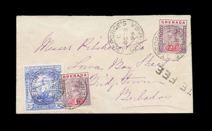 385 c S.G. #49, 56 imageS.G. #56, 1898 2 1/2p Columbus Commemorative, tied to cover for posting to Barbados, additionally two 1895 1p Mauve and carmine (S.G. #49) applied, all tied by "St. George's/Grenada/OC 28 98" c.d.s., this cover was posted the morning the mail packet arrived and thus was assessed a late fee of 2p, portion of straight line "(La)te Fee" handstamp at right, Barbados squared circle backstamp, exceptionally fresh and extremely fine; a pretty and scarce usage (Scott #40, 47). (Image) Est. 300-400
