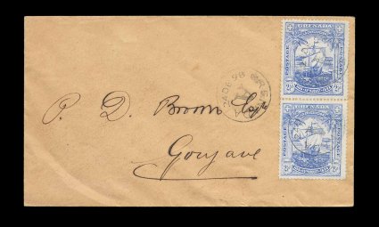 386 c S.G. #56a imageS.G. #56a, 1898 2 1/2p Columbus Commemorative on bluish paper, vertical pair on local cover with central "Grenada/A/24 DE 98" c.d.s. of the parish post office at Gouyave, matching strike at left, very fine and attractive (Image) Est. 200-300