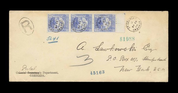 387 c S.G. #56a imageS.G. #56a, 1898 2 1/2p Columbus Commemorative on bluish paper, top sheet margin vertical strip of three, well centered and attractive, on registered business size official envelope with stamps over the OHMS imprint and "Colonial Secretary's" of the official cachet at bottom crossed out and "Postal" written in, stamps are cancelled by small "St. George's/Grenada/SP 14 98" c.d.s. with additional matching strike at right, backstamped New York, very clean and an attractive very fine cover (S.G. #47a). (Image) Est. 200-300