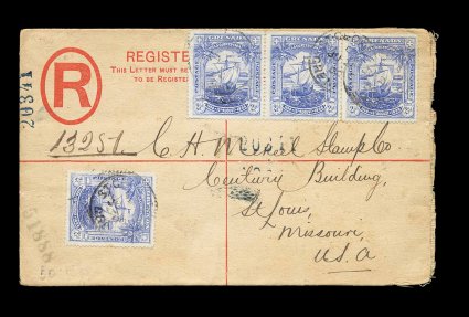 388 c S.G. #56a imageS.G. #56a, 1898 2 1/2p Columbus Commemorative on bluish paper, horizontal pair and two singles, tied to 2p Green blue registry envelope (H&G #C2a; 152x96mm) to the United States by "St. George's/Grenada/ JU 21 00" c.d.s., New York transit and backstamped St. Louis, opened a bit roughly at right causing small tear to backflap, otherwise very fine and a scarcer franking (Scott #47a). (Image) Est. 300-400