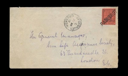 389 c image1902 Ship cover to London, mailed on board a ship which made port at St. George's with 1901 1p Black on red of Trinidad (S.G. #127), cancelled by straight line "Paquebot" handstamp, this handstamp had been sent to Grenada in 1899 and is the only "Paquebot" cancel that was used on the island, "St. George's/Grenada/JU 20 02" c.d.s. at left, put into the normal British transatlantic post to England since the franking paid the British Empire rate and backstamped London, opened on two sides and a few light edge wrinkles, otherwise very fine and a very scarce usage. (Image) Est. 200-300