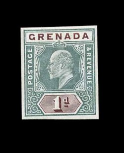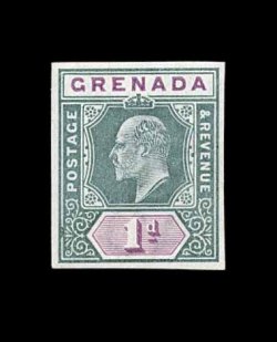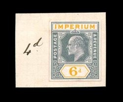 390 E image1902 6p Green and orange Key Plate essay, a generic essay to show this design, inscribed "Imperium" in the country name tablet, imperforate and affixed to small piece of archival sheet with "4d." written at right, a 4p value was never ordered by Grenada and this color combination continued to be used for the 1/- value as it had been in the previous Queen Victoria issue, very fine; ex-Towers (Scott #53). (Image) Est. 200-300