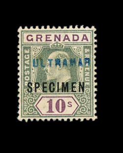 391 S S.G. #57s-66s imageS.G. #57s-66s, 1902 1/2p-10/- King Edward VII, wmk. Crown CA, with "Specimen" overprints cplt. these are the normally issued specimens that were distributed to the UPU countries, but this set, going to a Portuguese country, received the additional "Ultramar" handstamp overprint in blue, only three stamps with tiny corner creases, without gum as these were affixed to an archival page, which has caused the green color to change to a more yellow green, otherwise very fine and actually a remarkably nice set of these, it is not uncommon for these Portuguese sets to have numerous faults of a more serious nature than exhibited here (Scott #48S-57S). (Image) Est. 200-300