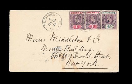 392 c S.G. #57, 58 imageS.G. #57, 58, 1902 1/2p Dull purple and green and 1p Dull purple and carmine pair, tied to neat cover to the United States by "St. Patrick's/Grenada/DE 15 04" c.d.s. with clear strike at left, St. George's transit and backstamped New York, cover opened out, otherwise very fine; this parish name cancel was probably used at the community of Sauteurs starting in 1898 until 1907 when a cancel was issued for Sauteurs, very scarce (Scott #48, 49). (Image) Est. 200-300