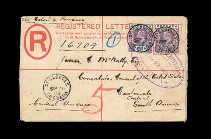 393 c S.G. #57, 59 imageS.G. #57, 59, 1902 1/2p Dull purple and green and 2p Dull purple and brown, wmk. Crown CA, tied to small 2p Prussian blue registry envelope (H&G #C3; 133x83) to Guatemala, stamps tied by clear strikes of small "St. George's/Grenada/SP 25 02" c.d.s. and by the large registry receiving handstamp of Guatemala City, Colon and Panama transits on the reverse, minor edge wear to cover, otherwise very fine; a nice contemporaneous usage of the first King Edward VII stamps and stationery to a scarce destination (Scott #48, 50). (Image) Est. 200-300