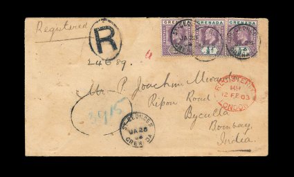 394 c S.G. #57, 59 imageS.G. #57, 59, 1902 1/2p Dull purple and green and 2p Dull purple and brown, wmk. Crown CA, two singles of the former on registered cover to India paying the correct 1p British Empire rate and 2p registry fee, all tied by "St. George's/Grenada/JA 28 03" c.d.s., red London registry transit, backstamped Byculla near Bombay, trivial perf. flaws to top of stamps and opened a bit roughly with two tears carrying to the front, not affecting markings or stamps, a fine and scarce usage (Scott #48, 50). (Image) Est. 200-300