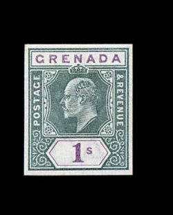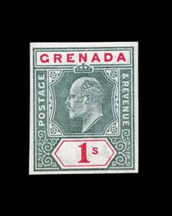 398 T S.G. #63 imageS.G. #63, 1902 1/- King Edward VII, wmk. Crown CA, trial color in green and carmine, imperforate, fresh, o.g., slightest trace of hinging, very fine; ex-Towers (Scott #54). (Image) Est. 150-200