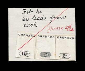 399 P S.G. #64-66 imageS.G. #64-66, 1902 2/- to 10/- Key Plate country name and value tablet die proofs, three original archival proofs in black on glazed card, for the three key plate values that were not issued in the Queen Victoria issue, approximately stamp size and all three affixed to piece of archival sheet with manuscript "Feb 4/60 leads from each", indicating the number of impressions to be laid out on the plate, red "June 19th 02." date with line tying the 10/- to the piece, very fine and unique "set" of working duty plate proofs (Scott #55-57). (Image) Est. 400-500