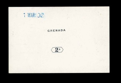 400 P S.G. #64 imageS.G. #64, 1902 2/- Key Plate country name and value tablet die proof, in black on glazed card measuring 92x60mm, dated "1 Mar. 02" with blue handstamp, one of the values not issued in the Queen Victoria key plates, very fine (Scott #55). (Image) Est. 150-200