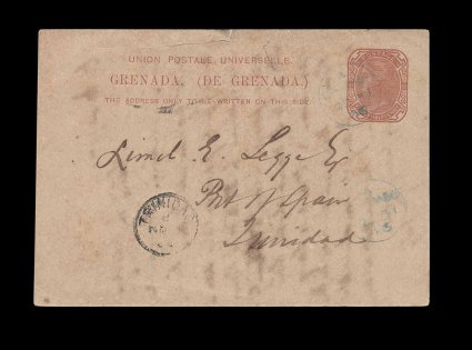 441 c H&G #2 imageH&G #2, 1881 1 1/2p Brown on buff postal card, exceptionally rare used card to Trinidad with light blue "Grenada/OC 31 83" c.d.s. with index letter "A", small Trinidad receiving c.d.s. on the front, overall toning typical of these cards and creasing at top causing some breaks, very fine appearance; a legitimate use with non-philatelic message on reverse despite the fact that the rate to Trinidad was only 1p (perhaps 1p card not available or confused about what was required), the collector believes only two used examples are known and we have seen no others. (Image) Est. 400-500